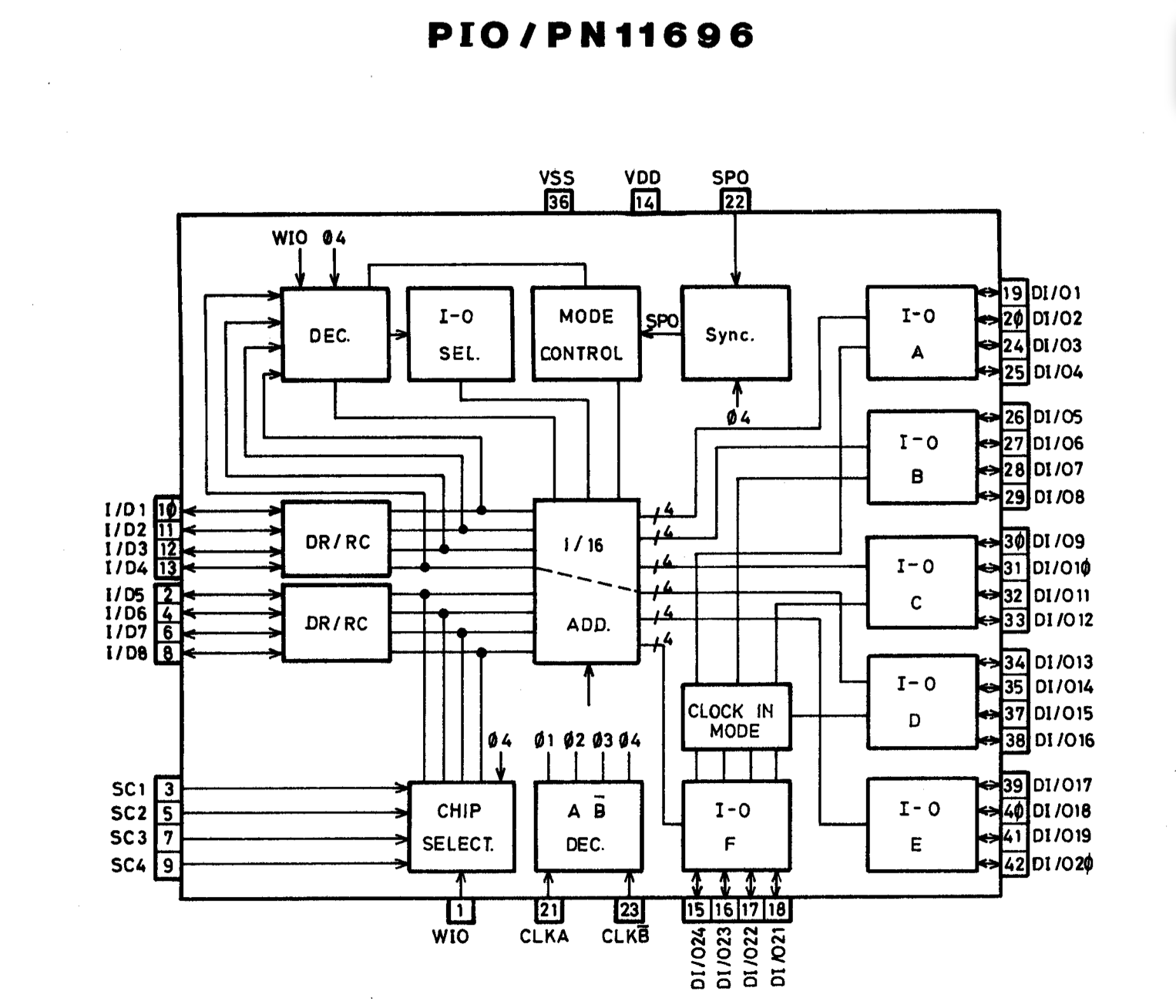 The 11696 is a PPS4-1 general purpose IO. Its synopsis is described on the figure below. It is similar to the 10696, but with notable differences. Mainly, instead of having 12 inputs and 12 outputs, it has 24 in/out channels. In this perspective, the HW internal circuitry is more like an A17 IOs subsection. It means that to configure a channel as an input one has to write '0' so that the pin is Hi-Z as an output and can be read from the corresponding input mosfet.