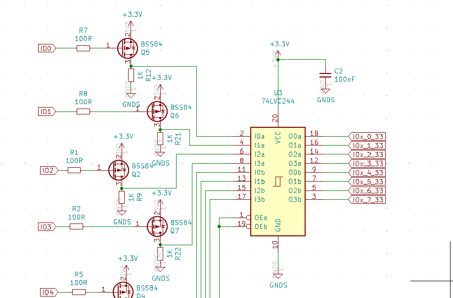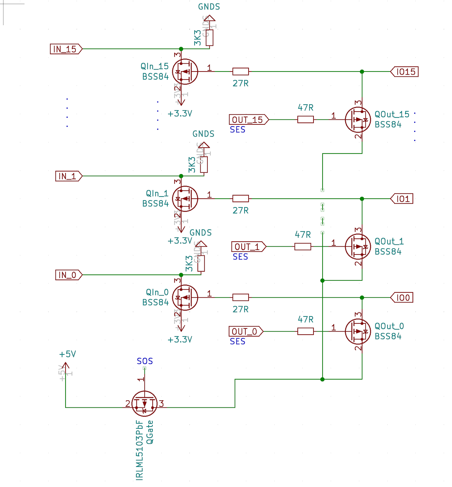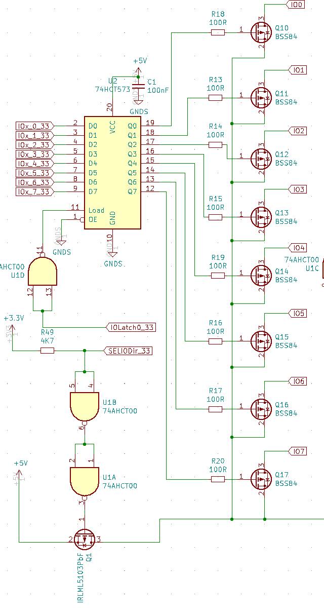 Have a particular attention to QGate. QGate will determine if all the outputs are Hi-Z, or deliver +5V, provided that QOut_x (for example, IO0) is on. So, for a given IOi, you have 3 MOSFETs involved. Example with IO0: