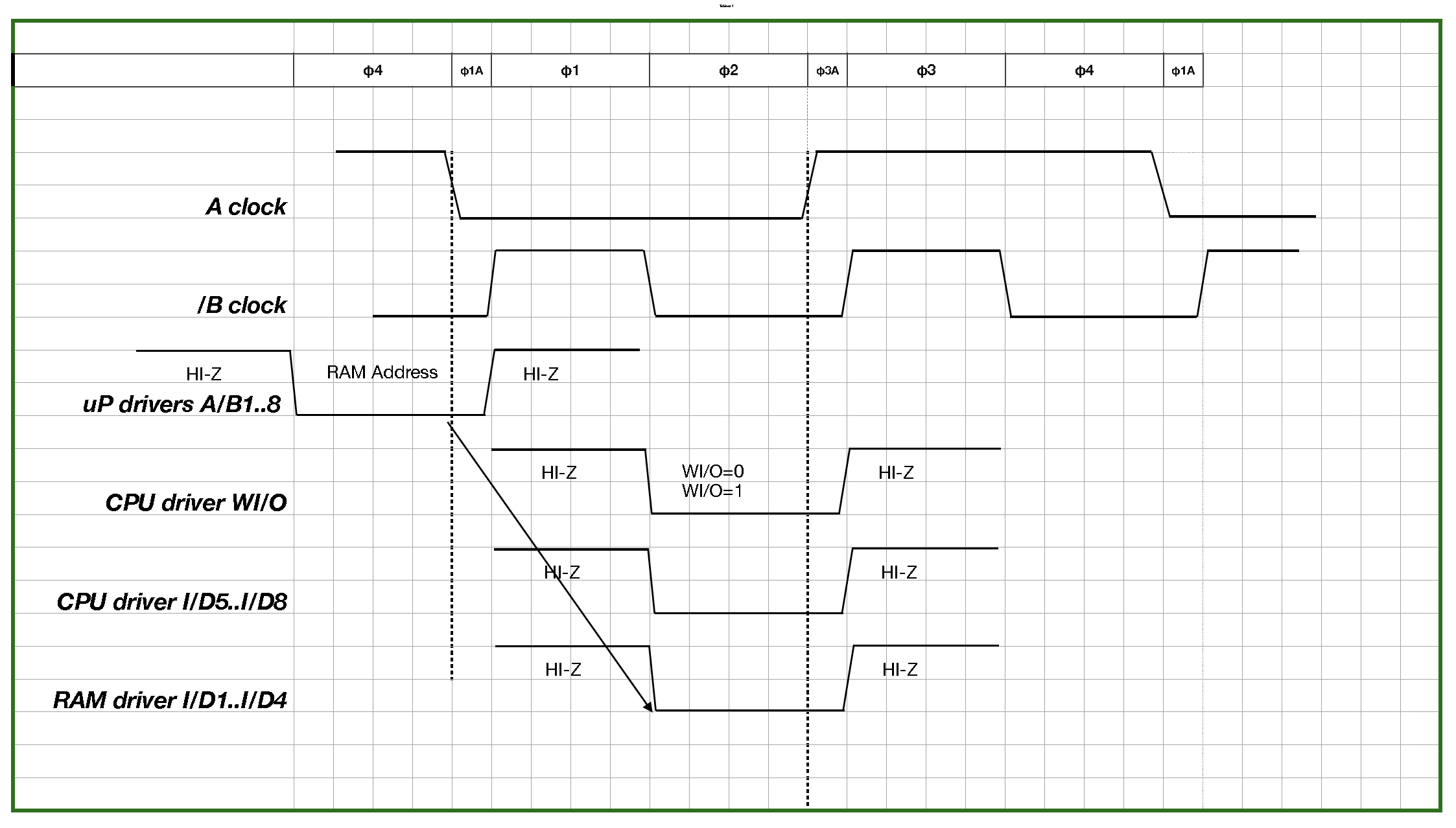In addition to this, WI/O is sampled by the device at the begining of φ3A. Depending on the value of WI/O, the nibble present on I/D5..I/D8 (placed there by the uP) is read simultaneously, and stored in the device.