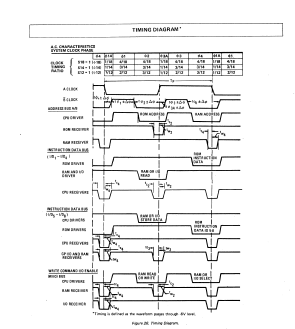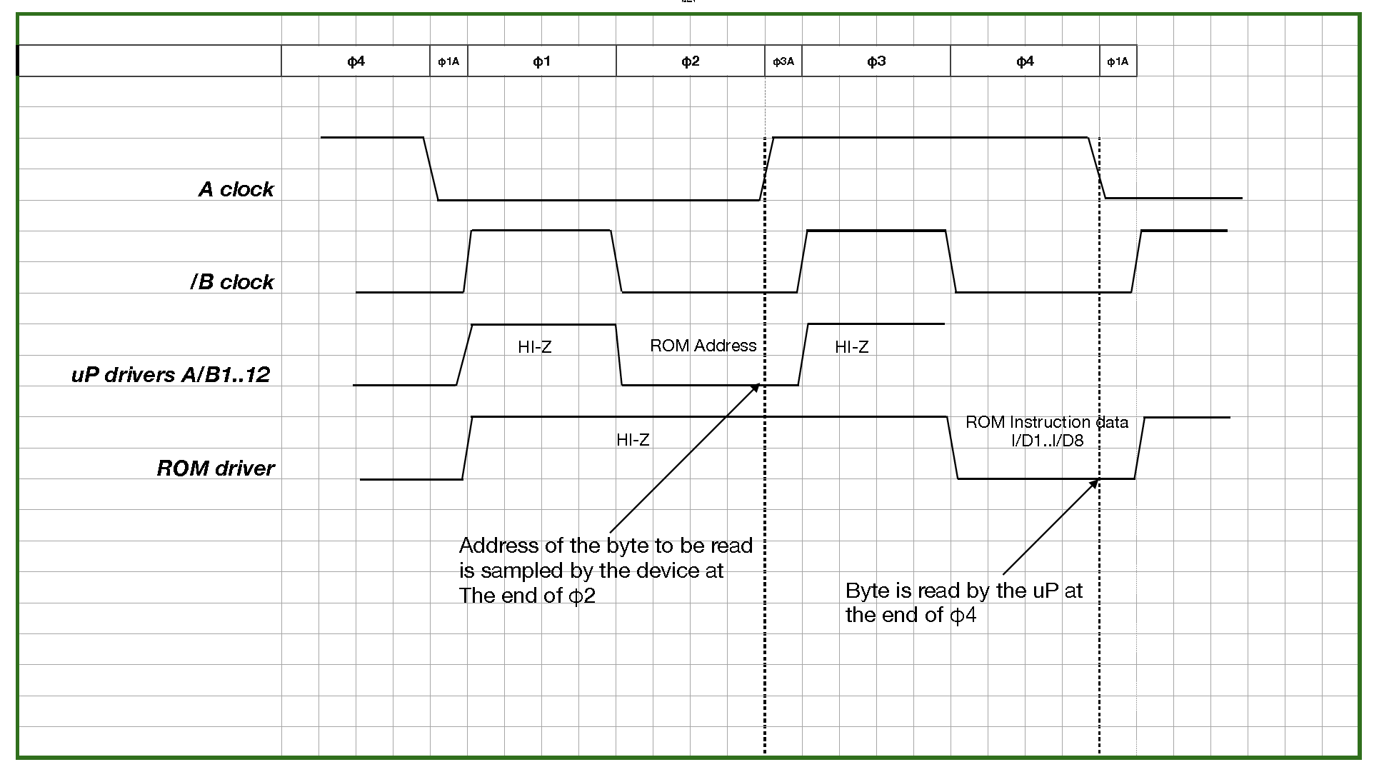 Clock signal transitions of A & /B define 6 distinct phases per cycle of 18 ticks. That makes the beauty of the PPS4 system. For each cycle: The A17xx ROM subfunction samples the eleven addresses lines A/B1..A/B11, plus RRSEL, at the begining of φ3A. Then, if RRSEL matches its internal configuration bit at that time, the device will place the 8-bit ROM content of the corresponding address on its data lines I/D1..I/D8. The data will be available to the uP for the duration of the next φ4+φ1A. They are expected to be read by the uP at the exact begining of φ1A. (see figure)