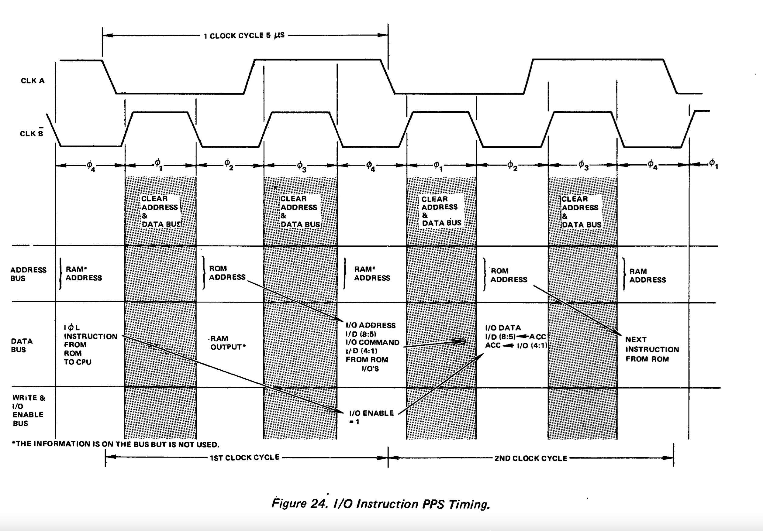 How is it managed from a coder point of view? Easy! IOL 0xhhll is the instruction, where hh contains the device ID, and ll the command. This functionality is common and identical for PPS4/1 and PPS4/2. But in the case of PPS4/2, prior to this instruction, the code must have set the adress register A/B to the number of the IO port. In PPS4/1, this address is only used for RAM access, thus it is (as specified in the doc) not used. Nevertheless, reading all these docs 50 years later, implies that it takes a while until you undertand that mess (which is nothing but History and evolution, eventually).