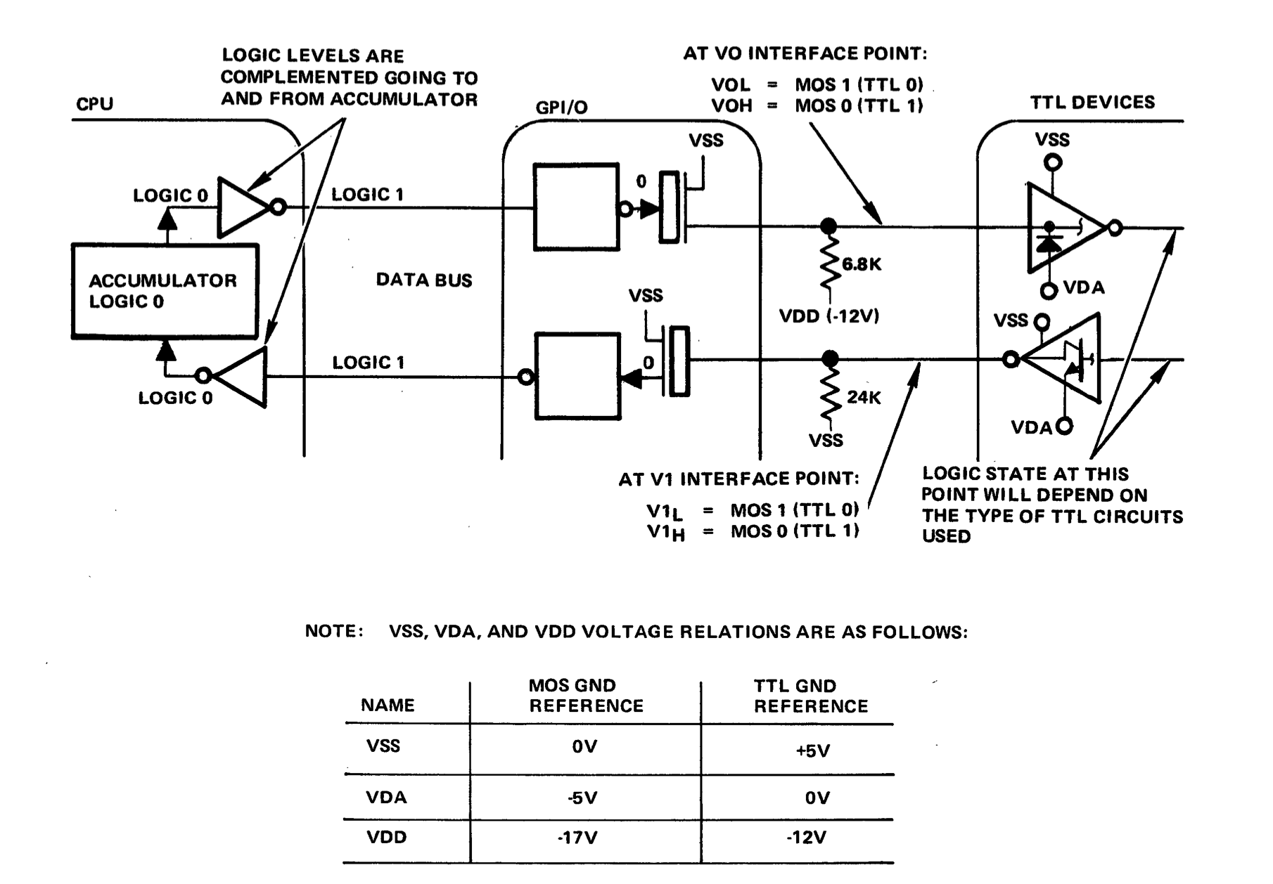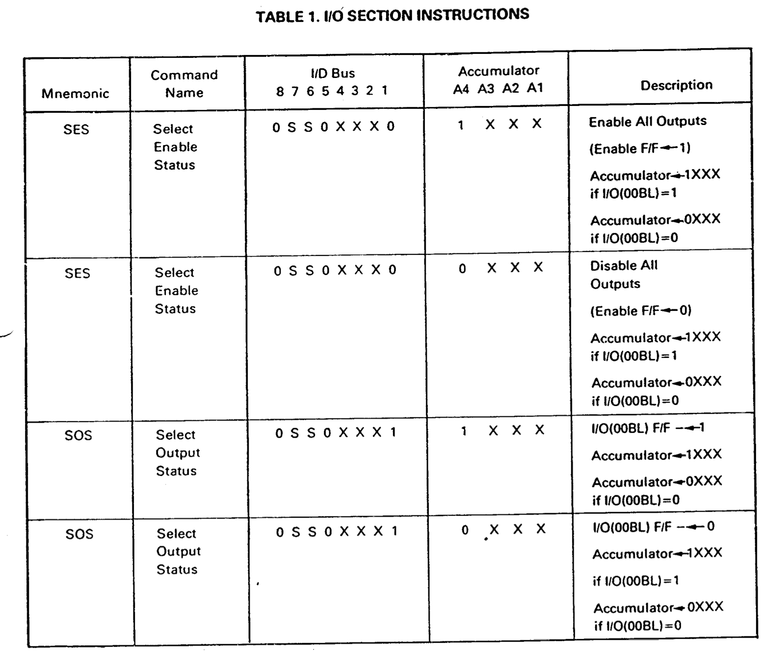 The I/O section is triggered by the execution of an IOL instruction in the uP which causes the WI/O line to signal all I/O devices in the system that the next instruction byte contains a device identification (4-bit) and the specific command to be executed (4-bit). The IOL instruction, via the WI/O line, also tells the RAM to stay off the data bus so that the input/output data may be transmitted.